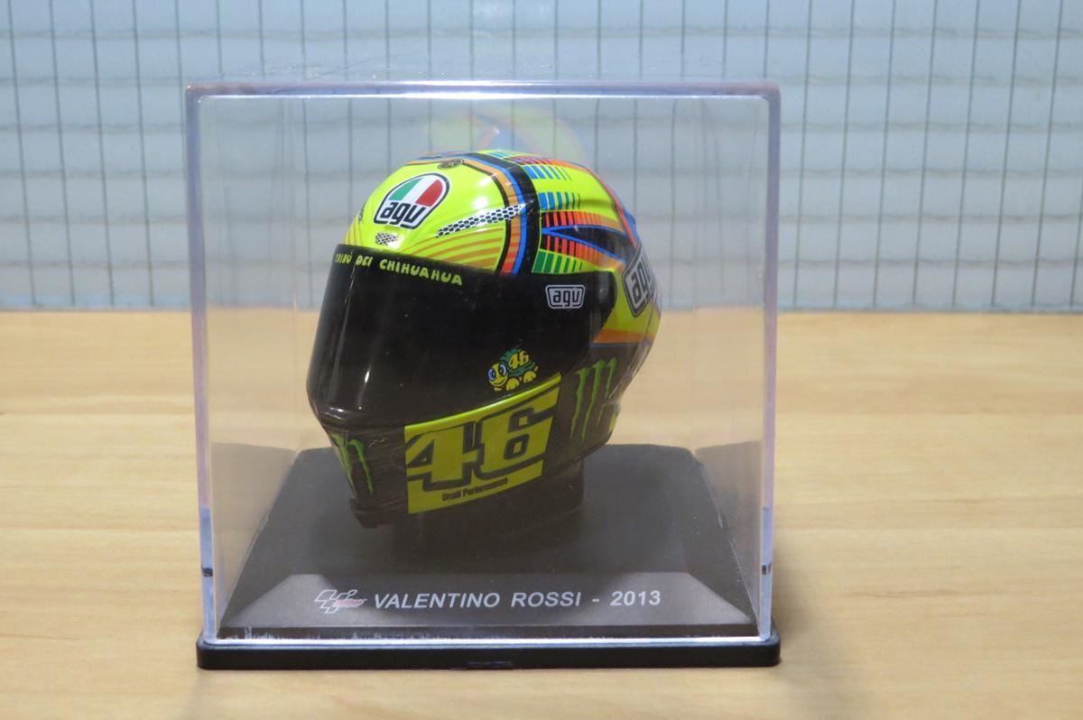 Valentino Rossi MotoGP 2013 replica Crash Helmet 1/5 scale. the crash helmet itself is displayed on a black plinth with a clear acylic cover, even the visor opens ! Manufacturer : Altaya