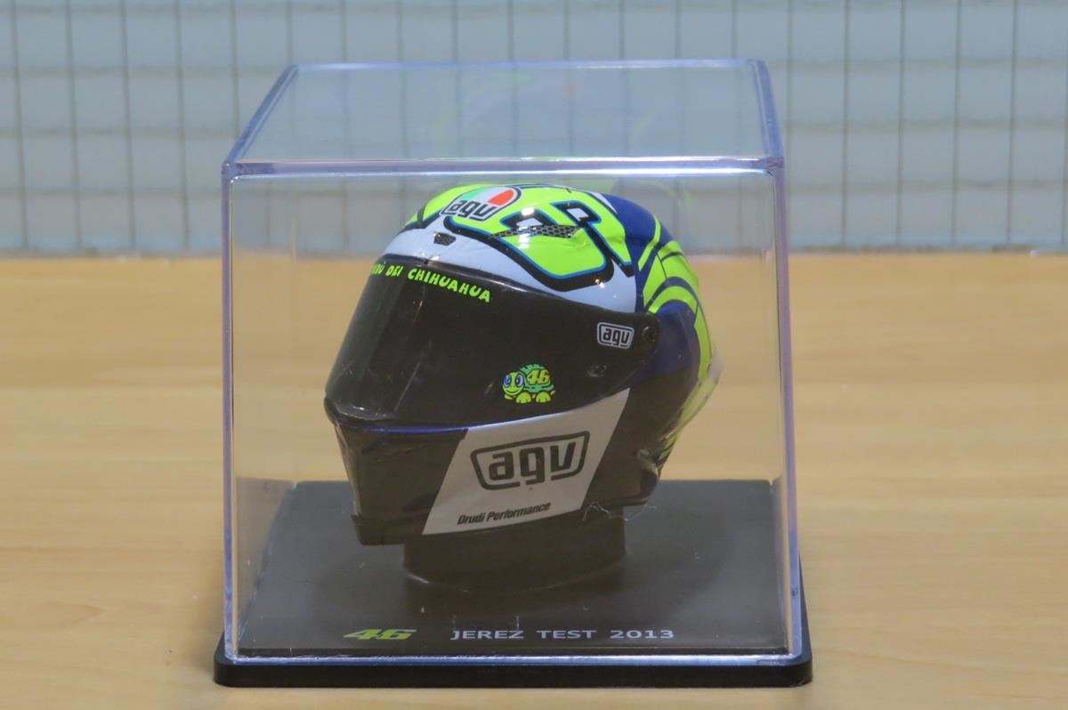 Valentino Rossi MotoGP 2013 replica Crash Helmet 1/5 scale. the crash helmet itself is displayed on a black plinth with a clear acylic cover, even the visor opens ! Manufacturer : Altaya